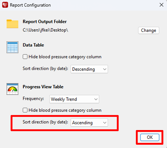 Step 3: On the Report Configuration window, in the Progress View Table section, select the desired Sort direction. Then click the OK button.