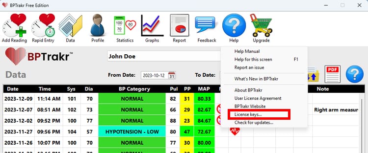 Step 1: Open the BPTrakr app on the computer that you want to install the license key on. On the toolbar, click on the Help button and select License Keys from the dropdown list. The License Keys window will appear.