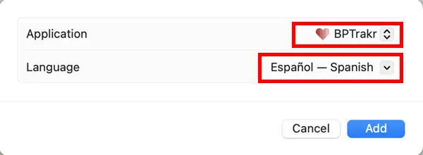 Step 5: On the Add Application window , click on the Application button. Find and select BPTrakr in the applications list. Select on your target language (in our example, it says Spanish) . Then click on the Add button.