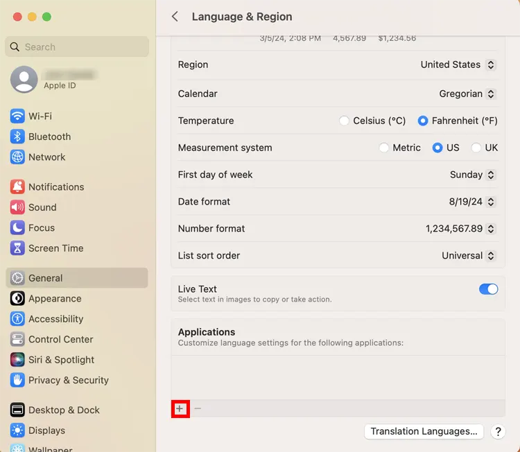 Step 4: On the Language & Region pane, scroll to the bottom to find the Applications section. Then click on the Add (plus sign) button. The Add Application window will appear.