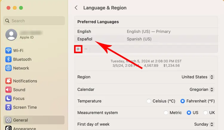 Step 3: On the Language & Region pane, Under Preferred Languages, check to make sure that your target language is in the list. In our example, Spanish is the target language. If your target language is not listed, click on the Add (plus sign) button. Then follow the prompts to add your target language to the list under Preferred languages.