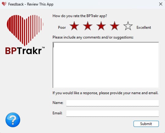 Any feedback that you can provide to us about the BPTrakr app , whether it be positive or negative, is very valuable to us because it helps us improve our product and create a better experience for you, our customer. The following two (2) in-app forms are available to submit feedback for the BPTrakr app: