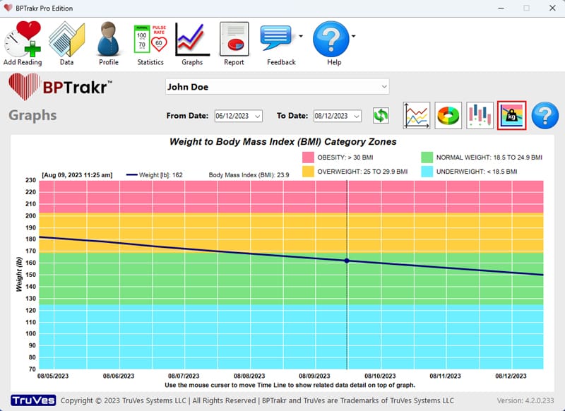- When weight is recorded with one or more blood pressure readings, and the user’s height is entered in the user’s Profile, the user’s weight progress is shown on the Graphs screen in relation to the user’s calculated Body Mass Index (BMI) category zones.