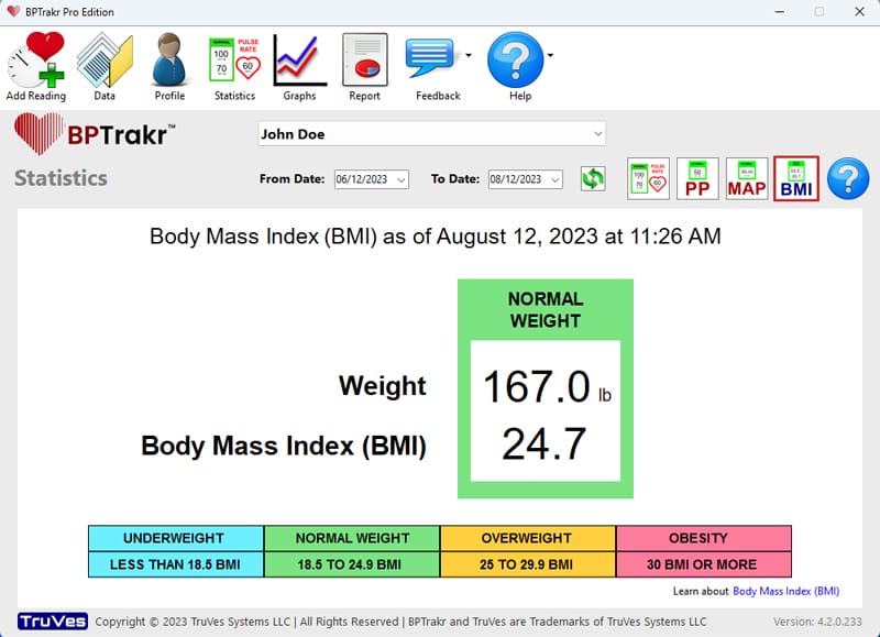 - When weight is recorded with one or more blood pressure readings, and the user’s height is entered in the user’s Profile, the user’s most recent Body Mass Index (BMI) is shown on the Statistics screen.