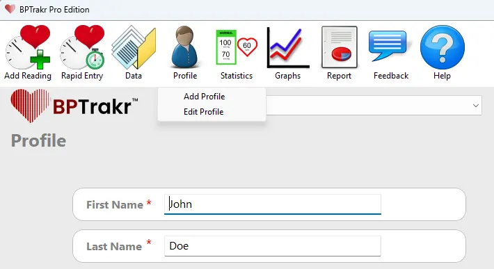 - If the application is being launched for the first time, the new user will be presented with the Profile screen in Add Profile mode automatically.