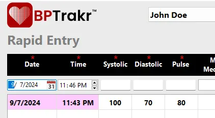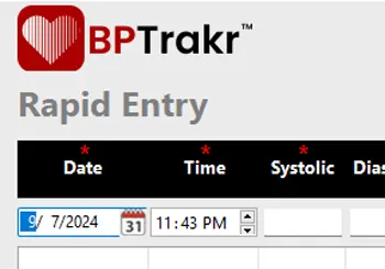 - The date and time of newly entered blood pressure records are now highlighted in pink on the Rapid Entry screen of BPTrakr.