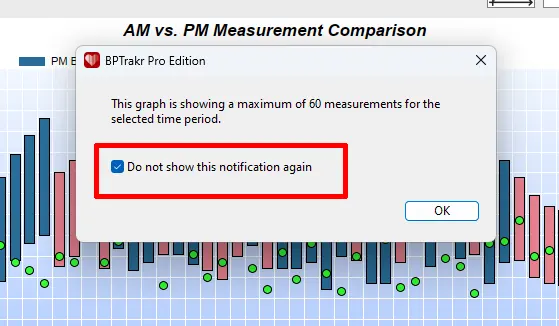 - Added an option to suppress future notifications on the AM vs. PM Measurement Comparison graph, when there are 60 measurements or more for the selected date range.