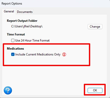 Step 3: On the Report Options window, select the General tab. Under Medications, Check “Include Current Medications Only”. Then click the OK button to save and close the Report Options window.