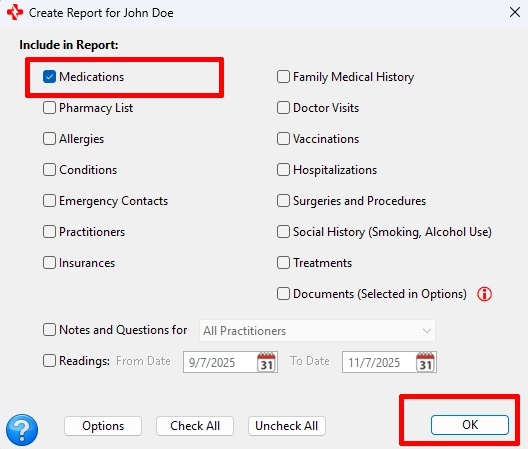 Step 4: On the Create Report window, if you want a single page PDF of your current medications, make sure that just Medications is selected. Then click the OK button to generate your MedZuse Report.
